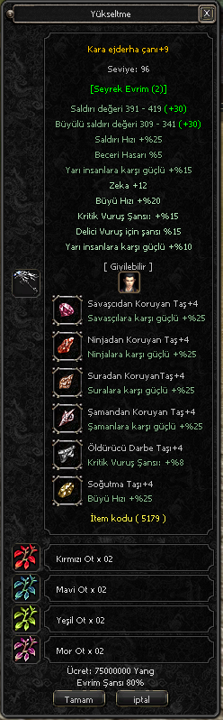 | Seyrek Evrim +30 STR | 2x Kırmızı , x2 Mavi , x2 Mor x2 Yeşil ot ve Evrim Metali karşılığında yapılır 50m yang ister |