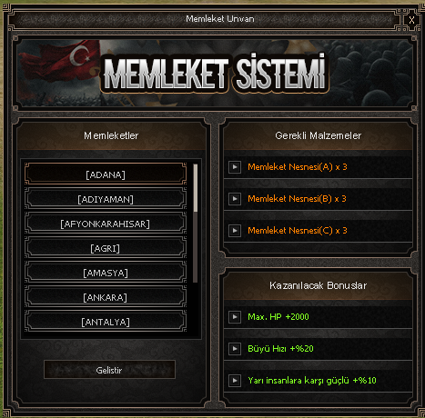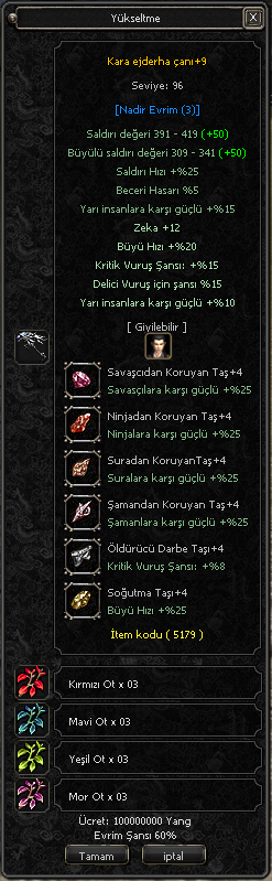 | Nadir Evrim +50 STR | 3x Kırmızı , x3 Mavi , x3 Mor x3 Yeşil ot ve Evrim Metali karşılığında yapılır 100m yang ister |