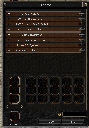 | Eşsiz Evrim +100 STR | 5x Kırmızı , x5 Mavi , x5 Mor x5 Yeşil ot ve Evrim Metali karşılığında yapılır 200m yang ister |